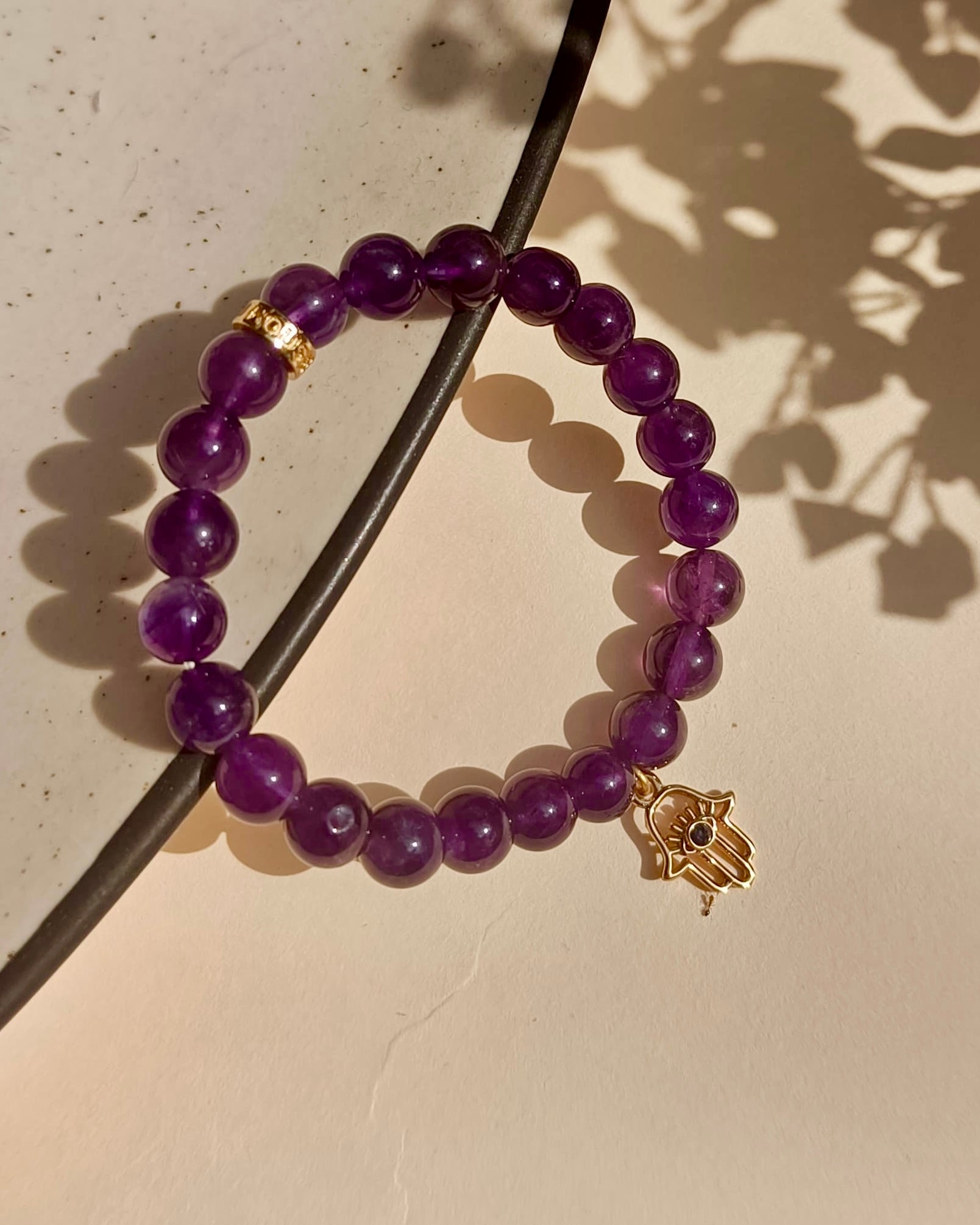 Inspired by spiritual wisdom and protective energy, this refined bracelet is handcrafted with polished Amethyst beads and adorned with a radiant 22kt gold-plated Hamsa Hand charm. The deep violet hues of Amethyst exude sophistication, while the Hamsa adds an ancient touch of strength and safeguarding.